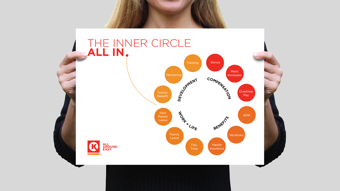 The challenge was to create a new look that expressed Circle K’s new brand strategy and create an employee engagement campaign that introduced employees to the Circle K brand promise and communicate the company’s total reward offering.